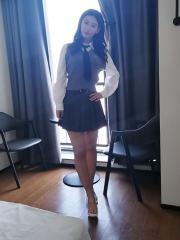 天气有点凉快,到达老师课室,穿着情趣装迎接,首先要说脸圆圆的很可爱(比照片要好看),身材方面一对大胸